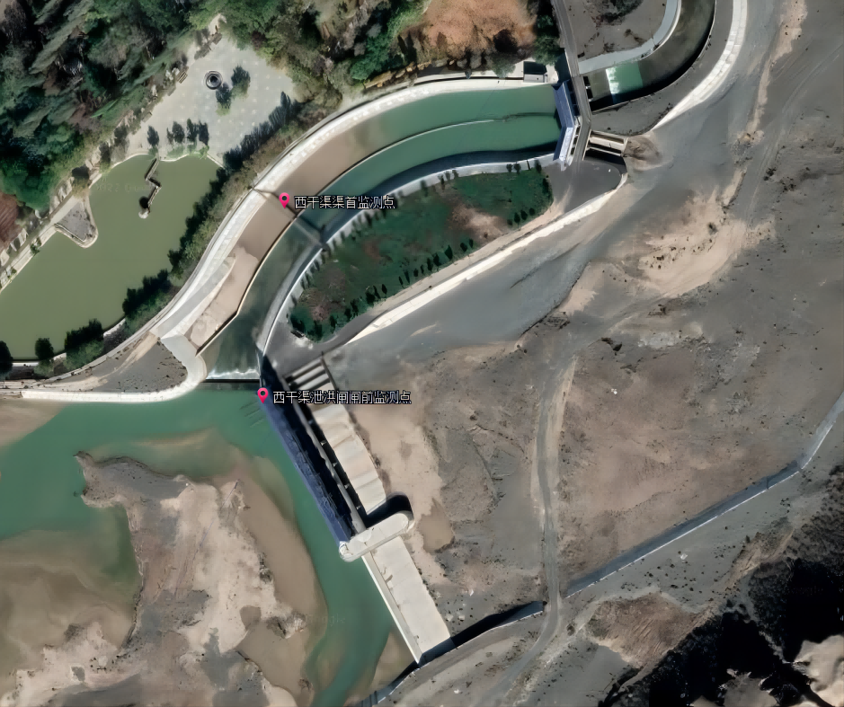 本次監(jiān)測(cè)方案為三屯河水庫(kù)閘門形變及強(qiáng)震監(jiān)測(cè),三屯河三道閘門俯瞰圖如下:
