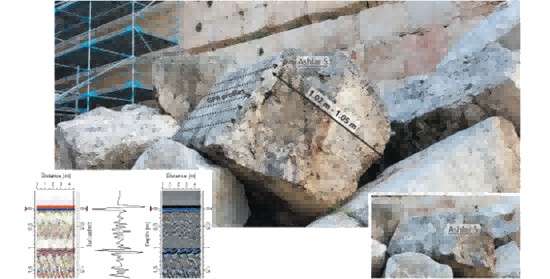 起初,工作人員并不清楚西墻中方石的尺寸,因此嘗試使用了750MHz和450MHz兩種天線。為獲取這些古老石材的準(zhǔn)確電磁波傳播速度,團隊首先對西墻外地面上鋪設(shè)的方石進行了測量:將得到的雷達剖面圖與方石的實際測量厚度進行匹配,由此確定了一個準(zhǔn)確的速度范圍——該速度范圍為西墻內(nèi)部隱藏方石的成像提供了關(guān)鍵參數(shù)。完成這一步驟后,工作人員才開始對西墻本體展開探測。