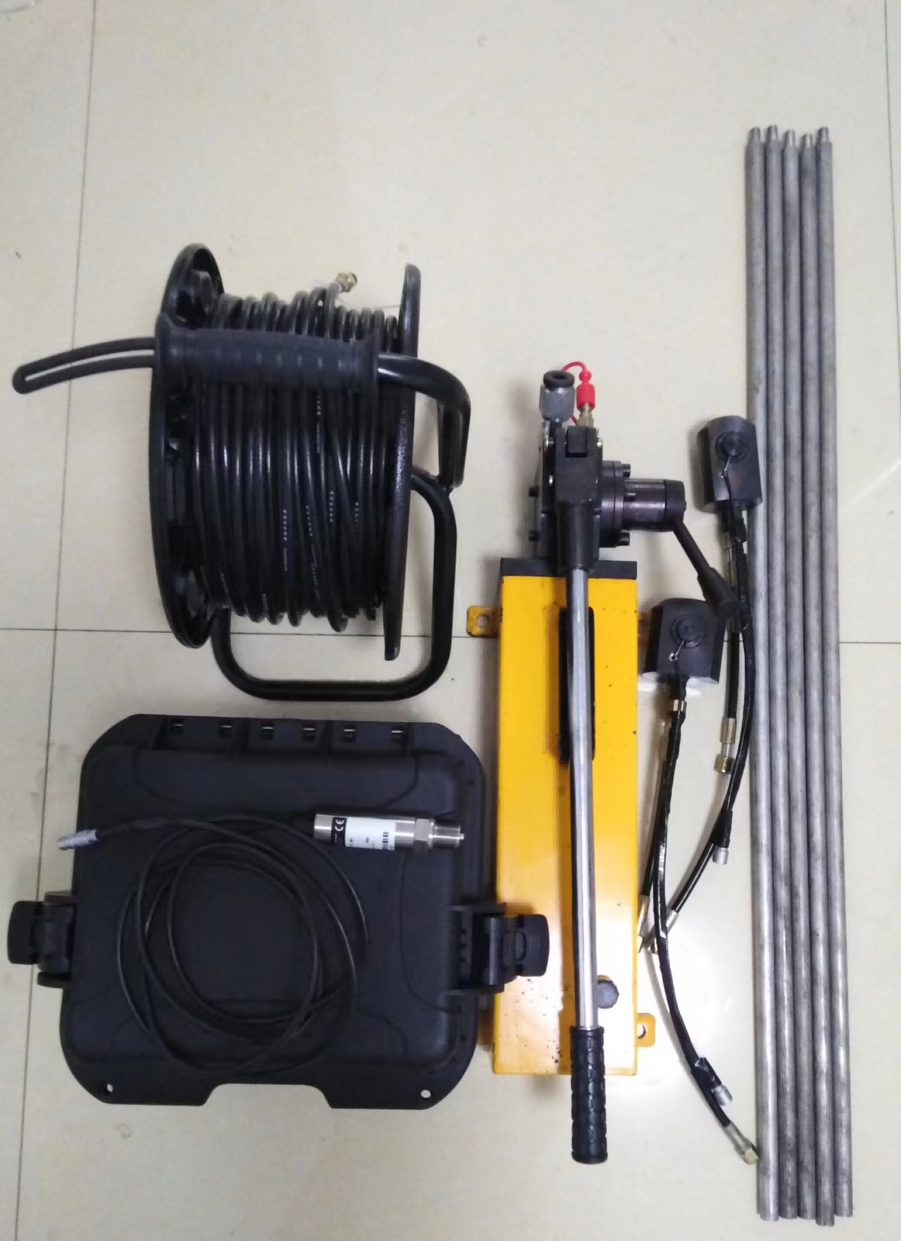 用安裝桿將探頭放至鉆孔測試位置,打開數(shù)據(jù)采集儀,加壓,注意位移變化,隨著壓力不斷升高,位移會(huì)緩慢增加,當(dāng)壓力達(dá)到測試點(diǎn)巖體臨界強(qiáng)度時(shí),位移會(huì)突然變大,壓力會(huì)突然變小,記錄臨界壓力值,該點(diǎn)測試完畢。