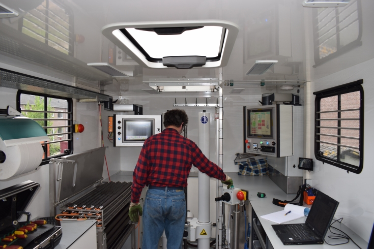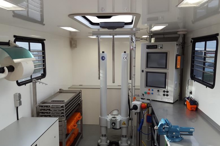 CPT貫入系統(tǒng)位于履帶式卡車的工作艙內(nèi)。在它旁邊,是操作貫入系統(tǒng)上下運(yùn)動(dòng)的桿,所有的電子設(shè)備、發(fā)動(dòng)機(jī)控制面板和控制元件都位于電氣柜內(nèi)。