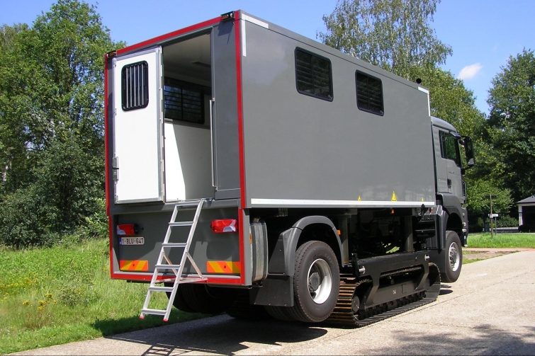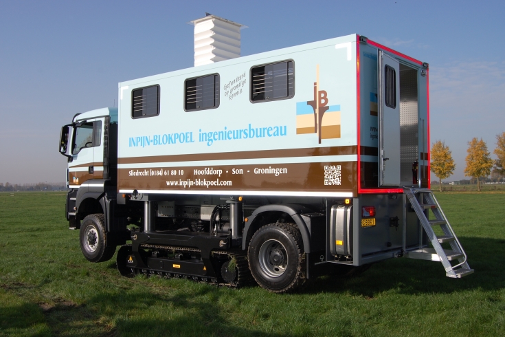 CPT履帶式卡車通常用于惡劣的工作地點(diǎn),因此將在4×4全輪驅(qū)動(dòng)卡車底盤上建造。在重量是本質(zhì)的情況下,你也可以選擇一輛帶有4×2傳動(dòng)系的卡車。在CPT履帶式卡車進(jìn)行CPT測試之前,要對(duì)其進(jìn)行水平調(diào)節(jié)。這是通過驅(qū)動(dòng)履帶式起落架上下運(yùn)動(dòng)的4個(gè)液壓缸來完成的。通過這些,CPT履帶式卡車可以精確地水平調(diào)節(jié),并且還保證了其在測試過程中的穩(wěn)定性。