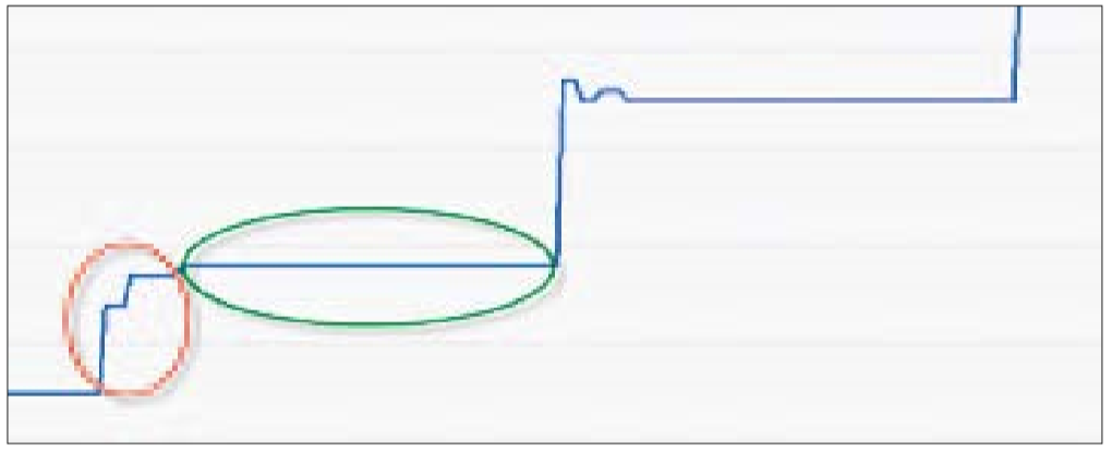 加熱階段,傳感器不進(jìn)行測量,整個加熱過程其會一直保留上一次最后測量的數(shù)據(jù)。筆直上升曲線(紅線)與1分鐘的測量周期相關(guān)。傳感器加熱、冷卻(綠線)占整個周期的5分鐘。傳感器必須始終供電以確保加熱功能正常工作。