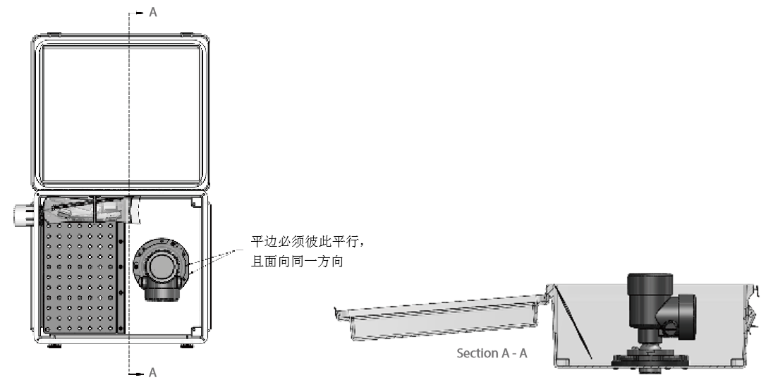 左側(cè)圖片為機(jī)箱俯視圖,顯示了傳感器的配置和安裝數(shù)據(jù)采集器的后面板。右側(cè)圖片為機(jī)箱剖視圖,顯示了傳感器的情況, 角被固定在傳感器上在機(jī)箱外面(未顯示)。
