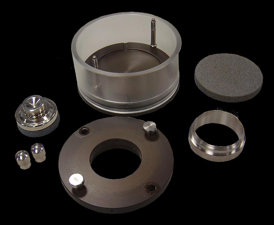 然后將剪切環(huán)夾緊在環(huán)刀上,并將壓力墊(其上連接有上部透水石)放在試樣上。 整個組件封裝在有機(jī)玻璃圓筒內(nèi)。