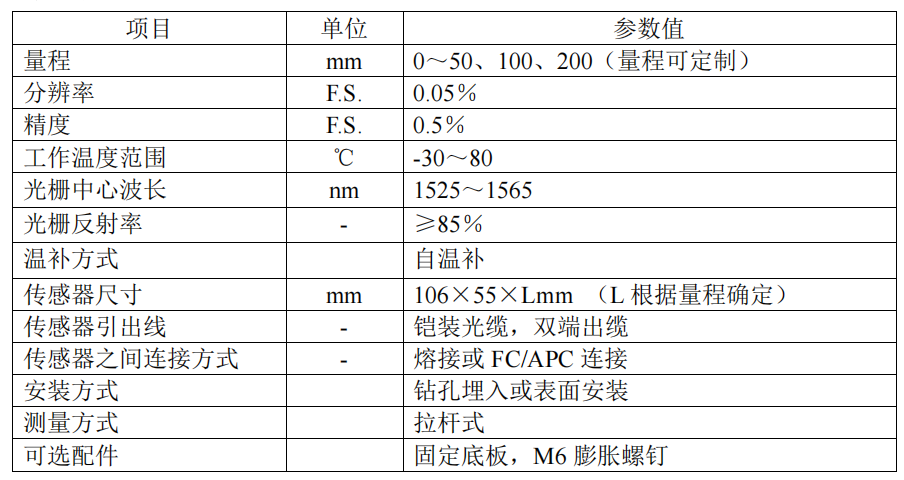 HT-OFD200 光纖光柵位移計(jì)采用全不銹鋼外殼設(shè)計(jì),具有抗壓、抗徑向力等特點(diǎn),適用于長(zhǎng)期布設(shè)在混凝土結(jié)構(gòu)、鋼結(jié)構(gòu)等表面,測(cè)量結(jié)構(gòu)物伸縮縫或周邊縫的開(kāi)合度(變形)??赏綔y(cè)量安裝位置的溫度,自動(dòng)進(jìn)行實(shí)時(shí)溫度補(bǔ)償,提高傳感器在不同氣候條件下的適應(yīng)性及監(jiān)測(cè)數(shù)據(jù)的準(zhǔn)確性。具有很高的精度和靈敏度、卓越的防水性能、耐腐蝕性和長(zhǎng)期穩(wěn)定性。可用于石油化工、水利水電工程、工業(yè)與民用建筑等結(jié)構(gòu)上裂縫或接縫開(kāi)合度的長(zhǎng)期監(jiān)測(cè)。傳感器采用探桿安裝方式,可以精確、快速測(cè)定橋梁、隧道、大壩、地下工程、邊坡的位移變形。測(cè)量精度不受光纖傳輸距離及電磁干擾的影響,可通過(guò)伸縮探桿或拉線兩種方式實(shí)現(xiàn)對(duì)伸縮位移的精確測(cè)量,標(biāo)準(zhǔn)量程為 0~200mm,具有溫度補(bǔ)償功能。