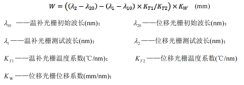 計(jì)算說(shuō)明:BA-OFD200 光纖光柵位移計(jì)采用雙光柵形式,進(jìn)行溫度補(bǔ)償。長(zhǎng)波長(zhǎng)光柵用于測(cè)量位移。在安裝完位移計(jì)之后,須紀(jì)錄兩個(gè)初始波長(zhǎng)為?10、?20 (下標(biāo) 1 表示測(cè)溫光柵,下標(biāo) 2 表示位移光柵),這兩個(gè)初始波長(zhǎng)會(huì)配置在初始配置文件中。在實(shí)際監(jiān)測(cè)過(guò)程中,光纖光柵分析儀會(huì)自動(dòng)讀取兩個(gè)測(cè)試波長(zhǎng)?1、?2 。然后由軟件按照以下公式計(jì)算出目前的位移值。
