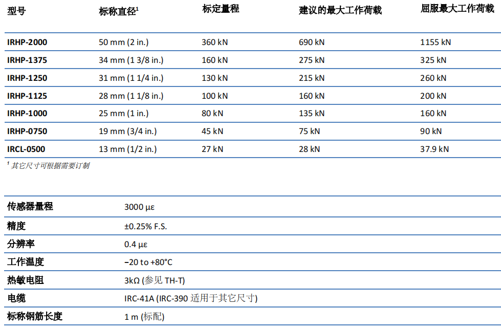 鋼筋計和姊妹桿配有內(nèi)置溫度傳感器。 IRHP是鋼筋計的型號,標(biāo)注鋼筋尺寸,而IRCL是姊妹桿的型號。