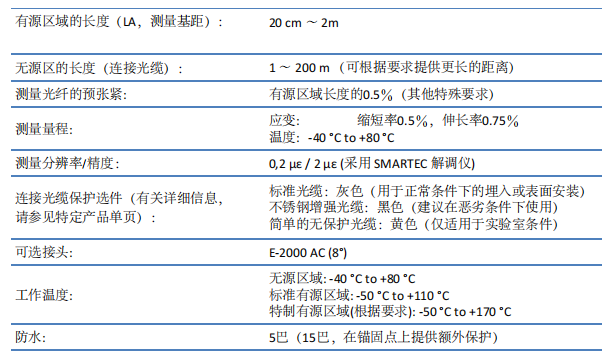 傳感器由有源和無源部分組成。 有源部件包含測量光纖,并測量其兩端之間的變形,并將其轉(zhuǎn)換為光纖布拉格光柵的波長偏移。 無源部件對變形不敏感,用于將傳感器連接到解調(diào)儀。 在傳感器的無源部分,可以安裝松散的光纖布拉格光柵以進行溫度感測和補償。