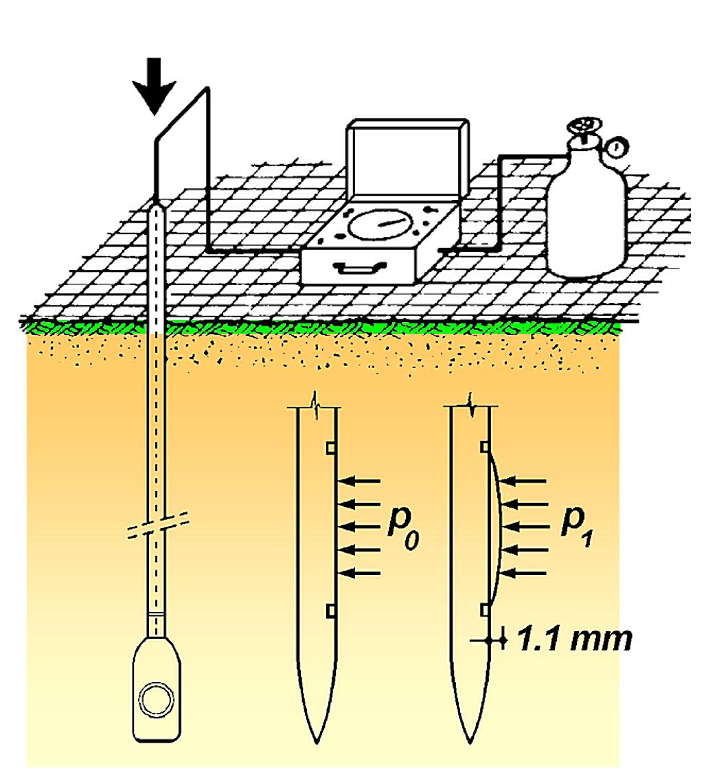 扁鏟可以通過一系列的連接探桿不斷地被垂直地貫入土中,連接探桿可以與靜力觸探探桿通用。扁鏟(探頭)和地面控制盒之間由一根特制的電-氣管路進(jìn)行連接。地面試驗(yàn)器件包括控制盒和壓力源,控制盒用來調(diào)節(jié)和監(jiān)控所施加的壓力,壓力源通常采用高壓氮?dú)狻?/span>
