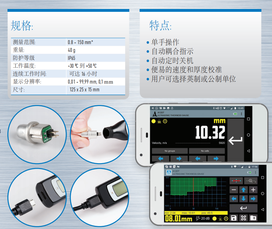 型 號:A1207原產(chǎn)地:德國ACS用 途:? 世界上最小最輕便的測厚儀 ? 只需三個(gè)按鍵即可輕松使用 ? 噴漆/涂層能力 ? 藍(lán)牙連接到智能手機(jī) ?iPhone和Android上的A掃描功能