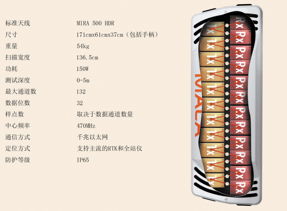 目前MALA公司的MIRA系統(tǒng)是市場(chǎng)上唯一能滿足上述四項(xiàng)要求的探地雷達(dá)陣列系統(tǒng)。