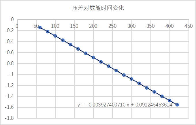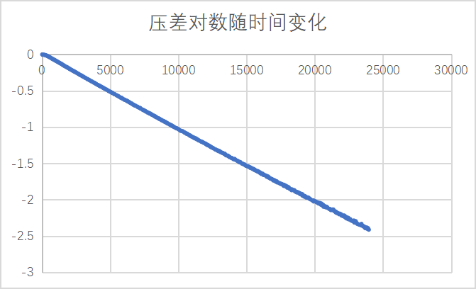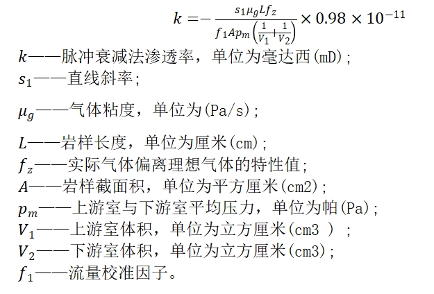儀器采用氣體作為介質(zhì),采用壓力脈沖法。壓力脈沖方法是現(xiàn)在最廣泛使用的測量低滲透巖心的方法,其測量過程是先將巖心飽和一定孔隙壓力的氣體,在其上游加一個壓力脈沖,造成巖心上下游出現(xiàn)壓力差,隨氣體的流動,記錄上下游的壓力變化,利用上下游壓力差與時間的對數(shù)成線性關(guān)系見下圖,按照下式計算脈沖衰減法滲透率值,求得巖心的滲透率,具體參考規(guī)范頁巖氦氣法孔隙度和脈沖衰減法滲透率的測定(GB/T 34533-2017)。