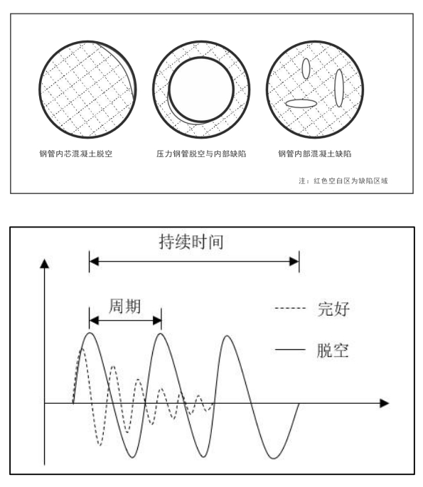 通過沖擊使得結(jié)構(gòu)表面產(chǎn)生振動(dòng);結(jié)構(gòu)脫空與否,結(jié)構(gòu)振動(dòng)信號的相位、幅度、頻率等特征信息會(huì)發(fā)生變化,根據(jù)這一系列特征判斷鋼結(jié)構(gòu)與混凝土接觸表面是否存在脫空。